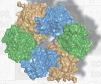 延伸体复合物环状结构固定住tRNA,它是由两个三蛋白组(标识为黄色、绿色和蓝色的三个蛋白组成的)成对排布而形成的。图片来自EMBL/S.Glatt。