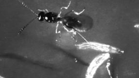 寄生蜂将它的卵放置在果蝇幼虫里,图片来自Milan et al., Current Biology。