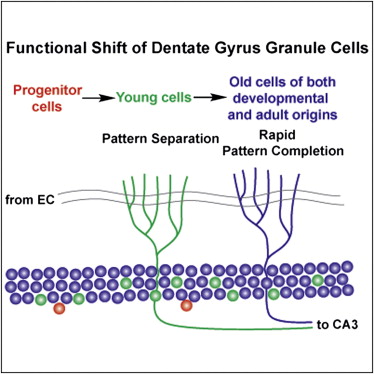 模式分离形成不同经验基础上的独特的新记忆;模式完成通过检测相似来恢复记忆。脑损伤或外伤的人可能无法回忆起他们每天都见的人。PTSD病人不能忘记可怕的事件。受损的模式分离由于失去年轻神经元可能有利于模式完成,这可能突出在PTSD病人中观察到的复发的可怕记忆回忆。神经科学家一直认为这两个对立且潜在竞争的过程出现在不同神经回路中。齿状回,是中枢神经系统内一个具显著可塑性的结构,它在抑郁、癫痫到可怕脑外伤中的作用被认为涉及到分离模式和模式完成的CA3区域。相反,麻省理工学院研究人员发现齿状回神经元可能执行模式分离或模式完成取决于它们细胞的年龄。