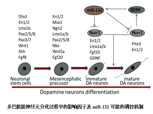 中科院上海生命科学研究院健康所神经基因组博士研究生杨德华等在乐卫东研究员的指导下,通过对于胚胎干细胞向多巴胺能神经元的发育过程中microRNA表达谱的变化分析,发现了一些新的microRNA,并且鉴定出其中一个miR-132在多巴胺能神经元发育的过程中表达显著变化。进一步研究表明,miR-132能通过直接靶向Nurr1,从而调节胚胎干细胞向多巴胺能神经元的分化。