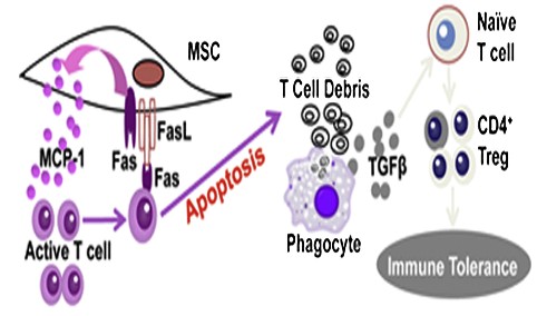 论文题目为Mesenchymal-Stem-Cell-Induced Immunoregulation Involves FAS-Ligand-/FAS-Mediated T Cell Apoptosis。 MSCs如何靶向作用于并击败过于活跃的免疫细胞。研究人员观察了输注MSC后肺系统性硬化症(SS)老鼠如免疫功能紊乱的影响,Shi与他的同事们发现一个特定的细胞机制--Fas / Fas配体信号途径是MSCs产生免疫系统益处的关键。
