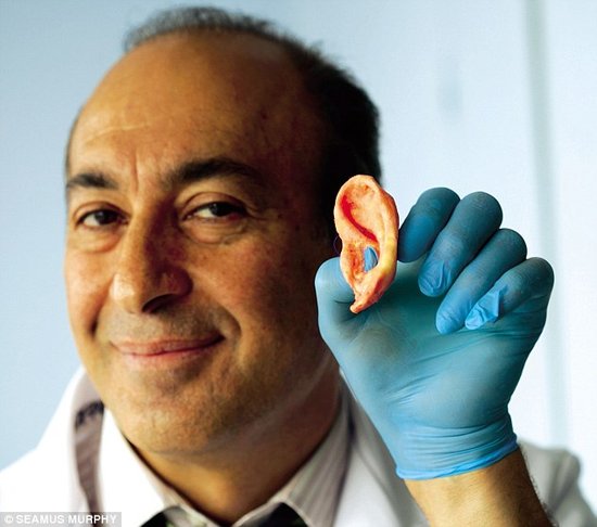 英国伦敦大学学院纳米技术和再生医学系资深教授塞法利安手里拿着一个在实验室里培育的人造耳朵,他表示我们掌握着人造器官的世界领先技术