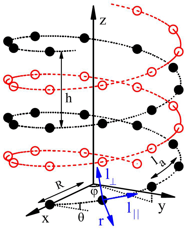 最近,中科院物理研究所/北京凝聚态物理国家实验室(筹)理论室博士后郭爱敏和研究员孙庆丰研究了DNA分子的自旋输运性质。双链DNA分子的空间结构如图1所示。他们考虑将单个DNA分子接在两个非磁性电极之间,给出了该系统的模型Hamiltonian,包括考虑自旋轨道耦合、退相干以及DNA的双螺旋结构。研究结果表明:(1)在存在退相干、螺旋和自旋轨道耦合的情况下,双链DNA分子具有较大的自旋极化率;并指出自旋极化流的产生是退相干、螺旋和自旋轨道耦合共同作用的结果,三者是缺一不可的(如图2所示)。(2)双链DNA分子的自旋极化率会随着其长度的增加而增大,如图3所示。当双链DNA分子长度为80个碱基时,自旋极化率能超过60%;(3)单链DNA分子不能过滤电子自旋。这与上述实验结果完全符合。此外,他们还研究了自旋极化率与系统的各种参数关系,发现通过适当地增加双链DNA分子的螺旋度,自旋极化率可以显著增加。