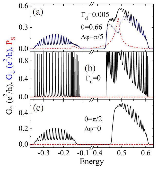 图2. 不同情况下自旋向上电子和自旋向下电子的电导,以及自旋极化率与能量的关系。