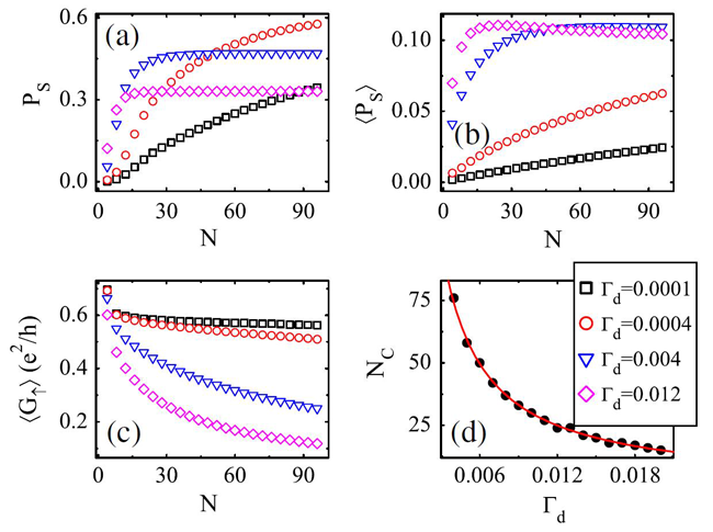 图3. (a) 自旋极化率,(b) 平均自旋极化率,(c) 平均自旋向上电子电导与DNA长度的关系。(d) 转变长度与退相干的关系。