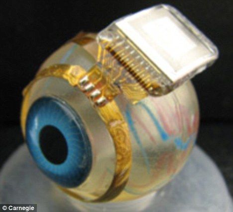 一个电脑芯片和这个眼球相连,把来自安装在一副眼镜中微型相机的信息传送给大脑。
