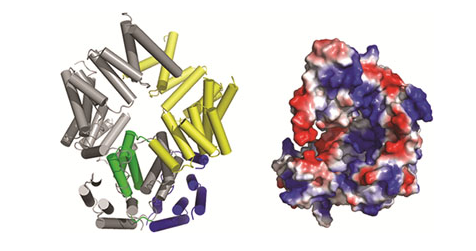 刘迎芳课题组通过解析晶体结构,发现ISG54具有一种全新的RNA结合蛋白结构,该结构含有9个tetratricopeptide repeat-like结构域,形成domain-swapped二体(如图)。ISG54的C端折叠成一个超螺旋结构,可以用来结合病毒mRNA。这些RNA结合位点的关键残基被突变以后,ISG54会丧失其RNA结合能力和抗病毒功能。