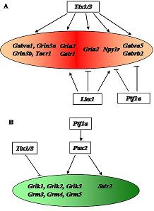 利用原位杂交及免疫组化染色技术,神经所研究人员发现多种神经递质与神经肽受体基因特异地表达在谷氨酸能神经元中。通过分析基因敲除小鼠的表型,发现这些受体的表达依赖于决定谷氨酸能神经元命运的转录因子Tlx1/3。转录因子Lbx1与Ptf1a同时也对这些受体在谷氨酸能神经元中的表达起调控作用。进一步实验表明,多种神经递质与神经肽受体基因特异地表达在γ-氨基丁酸能神经元中,它们的表达依赖于决定γ-氨基丁酸能神经元命运的转录因子Ptf1a;转录因子Pax2与Tlx1/3也对这些受体基因在γ-氨基丁酸能神经元中的表达起调控作用。