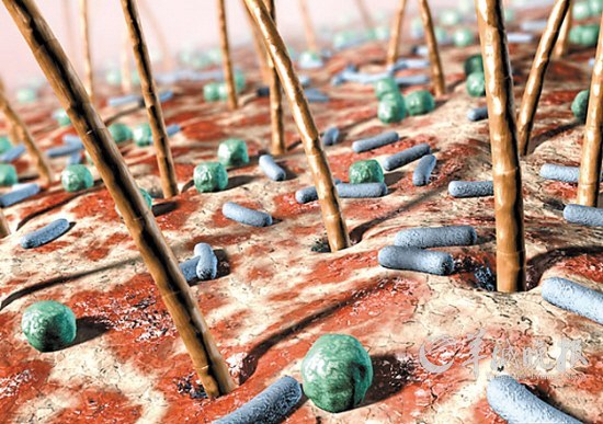 片中显示的是生活在人类皮肤上的细菌(蓝色和绿色的)