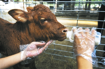 昨日,北京农学院综合实验基地,一工作人员正在给克隆牛“京秦1号”喂奶。“京秦1号”喝的是惠氏奶粉,3个月费用需要7000元左右。