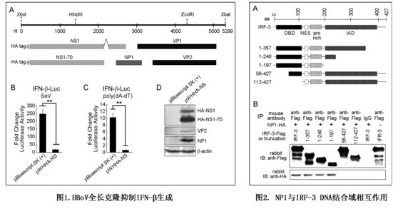 本文首次报道了HBoV非结构蛋白NP1能够抑制宿主天然免疫反应。主要机制为:NP1与干扰素生成过程中的重要调控因子IRF-3相互作用,封闭其DNA结合域,干扰IRF-3与干扰素启动子区的结合,进而抑制干扰素的生成。