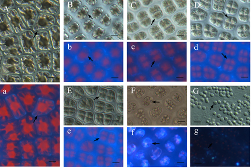 对条斑紫菜性细胞尤其雄性细胞分化过程系统研究发现,营养细胞和雄性细胞表现出相似的耐干出失水的生物学特性,表明营养细胞分化为精子囊的过程不受失水影响;条斑紫菜性细胞分化过程中PSII的实际量子产率Y(II)有显著的增加,表明是为条斑紫菜精子细胞的形成和释放提供物质和能量的储备。