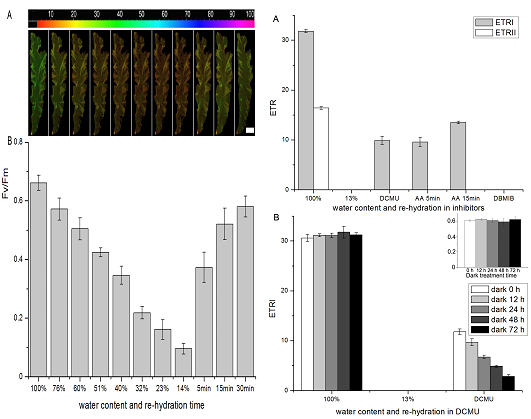 研究人员发现,条斑紫菜干出失水时环式电子传递持续增强,致使PSI活性显著上升;在严重失水时,PSI比PSII有更强的耐受性,其原因为PSI驱动的环式电子传递的运转。研究还表明,在复水过程中,PSI活性的恢复明显快于PSII,主要源于叶绿体内NDH介导的环式电子传递。