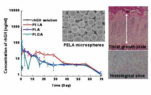 近日,中科院过程工程研究所马光辉研究员领导的团队开发出了一种粒径均一的rhGH缓释微囊(如图所示)。首先,利用W/O/W复乳液法将rhGH装载于两亲性材料聚乳酸-聚乙二醇共聚物乳液中,并结合快速膜乳化技术实现了微球粒径的均一性。后续的体内大鼠模型实验表明,该制剂能够有效延长rhGH在体内的释放;并且很好地保持了rhGH的活性,大鼠骨骼增长明显,提高了治疗效果。另外,与传统的PLA、PLGA微囊相比,该制剂不产生炎症反应,对心、肝、肾等主要脏器功能无影响,是一种安全的缓释载体。