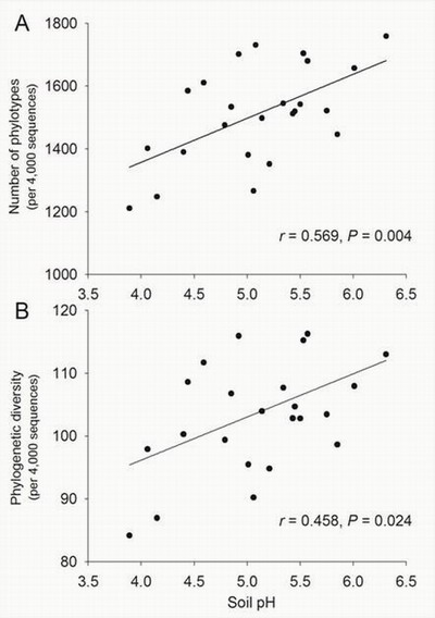 中科院南京土壤研究所褚海燕研究员团队和沈阳应用生态研究所合作,通过454高通量测序技术深入研究了长白山土壤细菌群落的垂直分布及其驱动机制。结果表明:1)土壤细菌群落组成随海拔梯度呈现出明显的分异;2)与动植物多样性不同,细菌多样性未呈现明显的递减和单峰趋势;3)细菌群落组成、多样性水平以及优势细菌门的相对丰度与土壤pH呈最显著相关。本研究也首次论证了pH也是驱动土壤细菌群落垂直分布的关键因子,从而拓宽了pH驱动土壤细菌生物地理分布的空间范围,即从水平到垂直梯度。