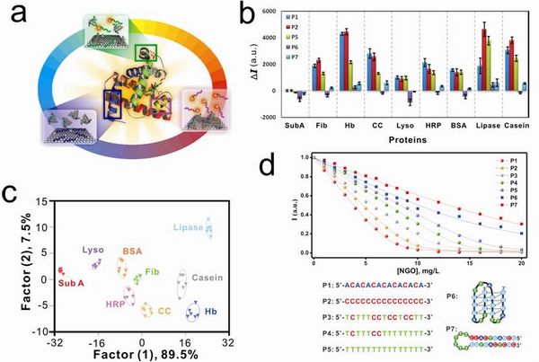 上海应物所研究人员在之前发展的氧化石墨烯与DNA相互作用平台基础上(Adv. Funct. Mater., 2010, 20, 453-459),筛选出一系列具有不同长度、序列及二级结构的DNA序列构成一个集合适配体。由于氧化石墨烯是一个平整的二维结构,DNA分子与其的相互作用不仅稳定而且可以很好地预测,非常适合构建模式识别体系。蛋白质分子具有不同的三维结构和表面性质,这种集合适配体能够依据每个识别单元与蛋白质靶标的不同相互作用,像鼻子一样精确地“嗅出”这些分子,可以对不同种类、不同浓度的蛋白质进行有效区分。