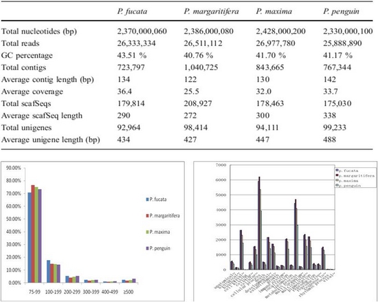中国科学院海洋生物资源可持续利用重点实验室(依托于南海海洋研究所)何毛贤研究员领导的团队经过近几年的努力,在珍珠贝免疫及矿化基因对环境因子变化的响应方面取得了良好进展:获得了马氏珠母贝、珠母贝、大珠母贝和企鹅珍珠贝四种珍珠贝的转录组数据库;GO, COG 和KEGG聚类分析对比表明,这四种珍珠贝的聚类分布基本一致,且这些数据可以相互验证和补充,为珍珠贝生长、发育、免疫及珍珠/壳形成相关功能基因的研究奠定了基础。
