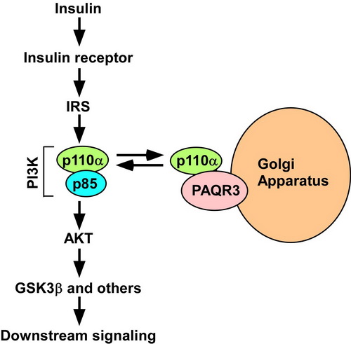 图: PAQR3调控PI3K和胰岛素信号通路的模式图
