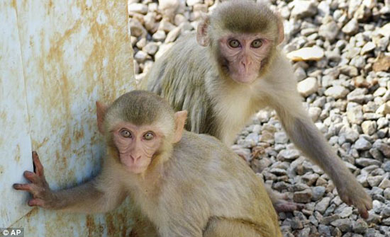动物测试:如图所示,科学家使两只恒河猴的眼球转动于两个圆点之间,转动频率为每秒一次。然后观察它们的脑部活动。