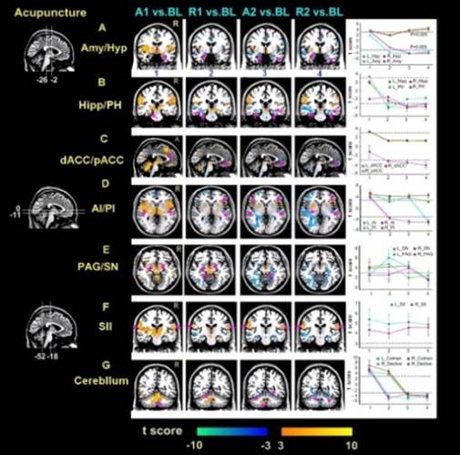 基于以上需求,中科院自动化所研究员田捷带领的团队承担了中科院知识创新工程重要方向项目“针刺中枢神经动态特性研究”,该研究立足传统中医理论,以针刺持续性效应为切入点,指出了国际十年针刺影像学研究所采用的实验设计及分析方法存在的共性问题,对占国际针刺机理研究主导地位的理论提出质疑,并通过提出适合针刺持续性效应的实验设计模式及时变响应特征提取算法,为国际研究领域最具争议的穴位特异性问题提供了初步解答。在此基础之上,研究组将理论算法应用于临床问题的解决,为针刺临床典型适应症的靶向性作用机制提供了有效的评价方法。