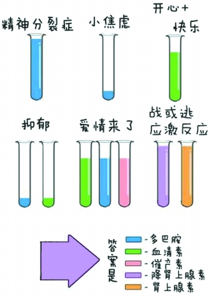 这张图形象地介绍了哪些基本元素“掌控”着我们的生命。图中共分了6组,分别是精神分裂症、小焦虑、开心+快乐、抑郁、爱情来了、战或逃应激反应。每组都有一些试管,装着不同颜色不同体量的液体。