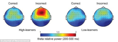 研究人员分析了脑电波反应时间,一些被称为好学习者的大脑脑电波扫描图显示在左侧,而不擅于从错误中学习的人的大脑脑电波扫描显示在右侧。