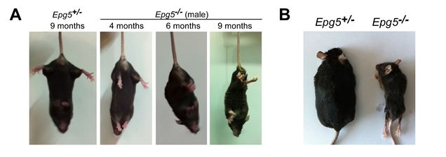 A.Epg5-/-雄鼠随年龄增长逐渐出现后肢交叉反应。B. 10月龄时,Epg5-/-雄鼠出现后肢完全瘫痪。