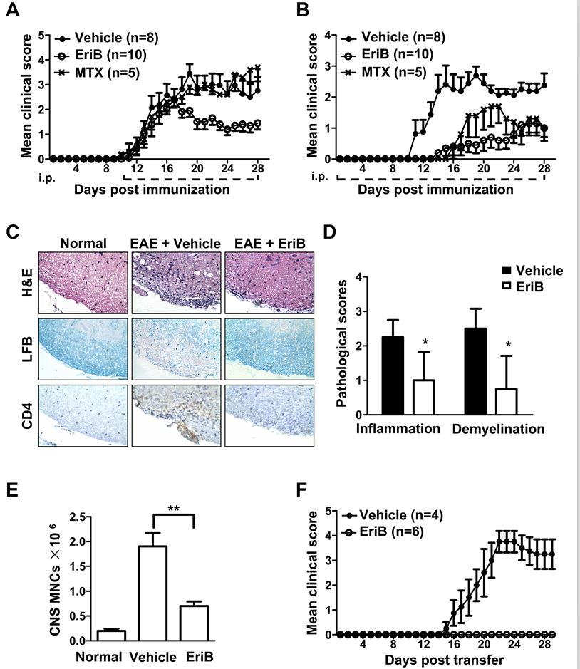 研究组前期研究结果显示,毛萼乙素可以抑制急性髓系白血病细胞内组成型活化的NF-κB信号通路,并显著延长白血病小鼠模型的生存期。同时,毛萼乙素可以通过上调活性氧(reactive oxygen species, ROS)水平来改变细胞的氧化还原状态,继而影响胞内许多对氧化应激敏感的信号通路以及转录因子的活性。基于NF-κB和ROS信号通路也参与许多自身免疫性疾病如类风湿性关节炎、系统性红斑狼疮和多发性硬化症的炎症反应,在此项研究中,研究人员利用MS的疾病模型小鼠实验性自身免疫性脑脊髓炎(experimental autoimmune encephalomyelitis, EAE)进一步探索了毛萼乙素潜在的抗炎性质。