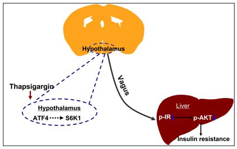 郭非凡研究组的博士生张倩等人发现,通过第三脑室注射腺病毒介导的ATF4过表达能够引起肝脏的胰岛素抵抗,而显性突变ATF4(dominant negative-ATF4)能够提高肝脏胰岛素敏感性;进一步研究证实ATF4对外周糖代谢的调节是通过下丘脑S6K1以及肝脏迷走神经信号传递的;另外,本研究还证实了ATF4是中枢内质网应激引起外周胰岛素抵抗过程中的关键调控因子。