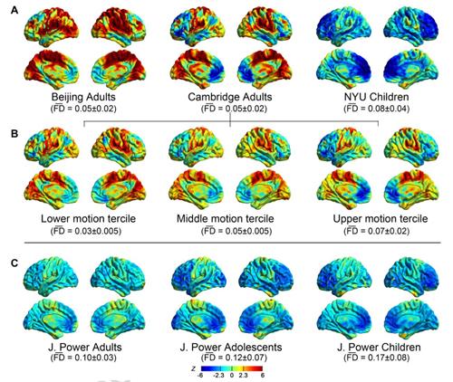 2)系统地考察了目前存在的各种头动矫正方法,指出没有一种方法可以完全去除头动对各种人脑功能连接组测量指标的干扰,揭示在组水平上建模和回归掉个体头动差异的必要性;