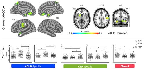 1)ADHD和ASD都在楔前叶(脑连接组网关区域)表现出中心度异常;