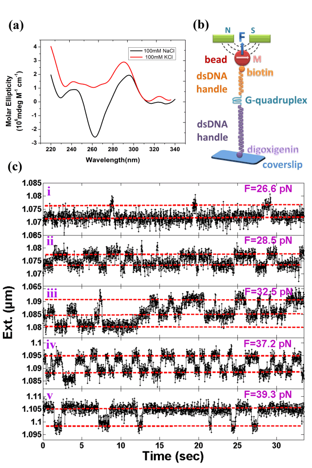 图1 G-四联体折叠和去折叠的动力学。(a)CD测量结果显示在100mM NaCl缓冲液中G-四联体呈现反平行结构。(b)磁镊测量示意图。(c)不同拉力作用下G-四联体折叠和去折叠的实时动态过程。