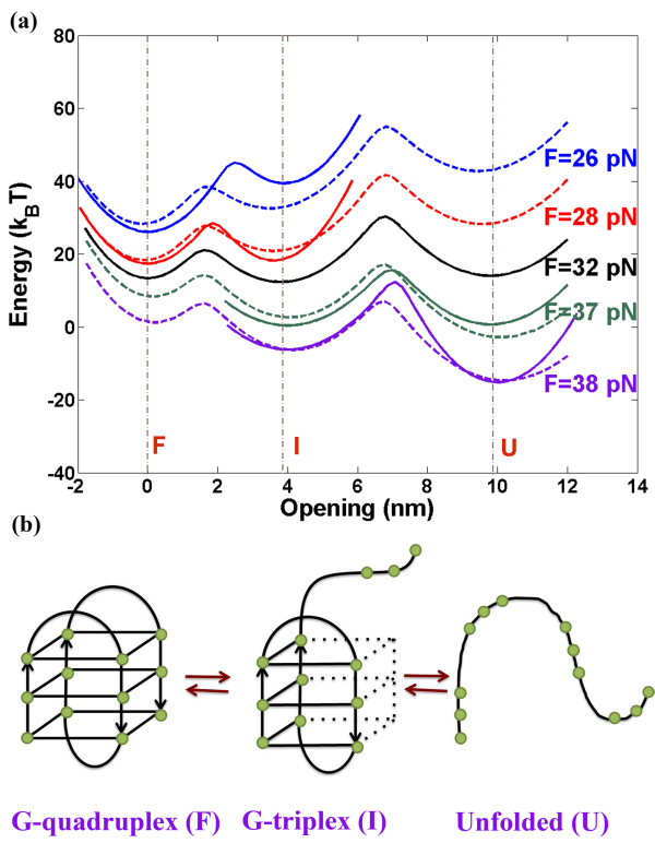 图2 根据实验结果建立的G-四联体折叠和去折叠的自由能曲线(a),以及据此提出的G-四联体折叠-去折叠模型(b)。