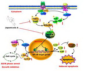 王慧研究组李晓光、杨新颖、刘燕玲等研究人员利用27种肿瘤和正常细胞株及多种动物模型系统评价了Japonicone A抗肿瘤活性,并深入探讨了其潜在的抗肿瘤分子机制。研究发现,Japonicone A可以选择性杀伤肿瘤细胞尤其是BL细胞(IC50在0.4~0.8 μM左右),阻断细胞内部TNFα-TAK1-IKK-NF-κB级联信号通路,抑制TAK1/TAB1复合物的形成和激活,阻止NF-κB的激活和入核,下调其下游靶蛋白(如参与细胞生长和周期进展的蛋白Cyclin D1、c-Myc以及参与细胞凋亡过程的靶基因Bcl-2、Bcl-xL、XIAP和TRAF2等)的表达,进而诱导细胞G2/M周期阻滞,促进凋亡。通过淋巴瘤小鼠皮下移植瘤和血液播散两种模型,发现Japonicone A可以显著抑制肿瘤细胞的生长和血液播散及脊椎、股骨和卵巢等部位的转移,有效缓解动物因肿瘤转移而出现的瘫痪现象。该研究显示Japonicone A具有发展为一种靶向NF-κB的临床抗淋巴瘤药物的潜能。