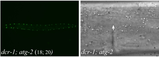 图示:在细胞自噬突变体中由小分子RNA诱导的基因沉默活性增强。A)细胞自噬基因atg-2 突变可以抑制由dcr-1活性降低导致的seam cell 数目增多。B) atg-2 突变可以恢复由dcr-1活性降低导致的alae发育缺陷。