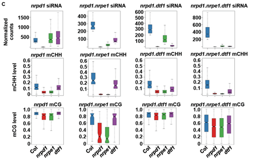 箱形图说明了产生小RNA区域的各个类型中小RNA水平和平均CHH、CG甲基化水平的分布情况。例如,dtf1.nrpd1类型表示这些区域的24-nt小RNA水平同时受DTF1和NRPD1影响。