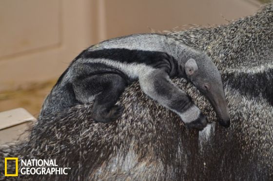 出生过程十分神秘的大食蚁兽“阿奇”(Archie)正趴在母亲的身上