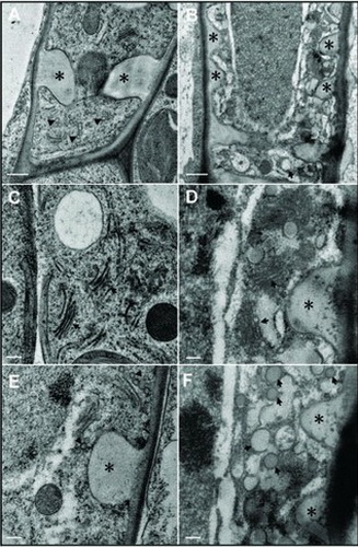 图2:EXO70A1基因突变导致分化的导管细胞中分泌囊泡大量累积 A、C、E:野生型;B、D、F:exo70a1突变体