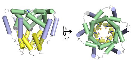 图1:HCV中重要阳离子通道蛋白p7的三维结构。该通道呈花瓣形的六聚体结构,每个单体由3个α螺旋组成