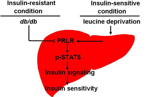 通过从“介导催乳素作用的催乳素受体(PRLR)”入手,中科院上海生命科学研究院营养科学研究所郭非凡组研究生于俊杰、肖斐等对PRLR调节胰岛素敏感性的作用和机制进行了全面系统的研究,揭示了PRLR通过激活STAT5来调节胰岛素敏感性的生理机制。研究发现,在小鼠通过腺病毒过表达PRLR能增强肝脏胰岛素敏感性,而敲低PRLR表达则降低肝脏胰岛素敏感性;另外,利用胰岛素抵抗的db/db小鼠模型和亮氨酸缺乏饮食诱导的胰岛素敏感性增强小鼠模型,进一步证实了催乳素受体对胰岛素敏感性的调节作用。
