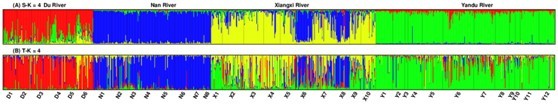 来自不同河流的领春木种群的STRUCTURE(A)和TESS(B)分析