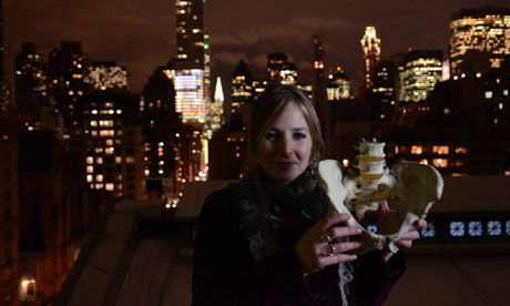 图为文章作者爱丽丝·罗伯茨(Alice Roberts)与一个人类骨盆。据称骨盆的形状是由行走和生孩子的需要决定的。