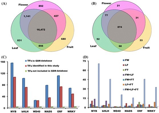 中科院武汉植物园果树分子育种学科组深入开展了桃功能基因组学研究,并取得一系列进展。该课题组王鲁研究人员通过RNA-seq测序技术,进行了目前文献报道的桃的最高通量转录组测序。该项目建成不同品种花、叶、果等组织的11个RNA样品库,完成21.5G的测序量,获得含有完整编码区序列信息的基因超过25000个,其中超过2000个在桃基因组测序和注释中未被发现,属于新发现的基因。相关基因的可变剪切形式、表达量均得到了充分的分析结果。另外从全部的转录基因序列信息中分析得到简单重复序列(SSR分子标记)17979个;各不同基因型之间对比得到的SNP分子标记约一万个。这些序列信息、表达情况以及分子标记将有助于通过遗传图谱进行桃的关键农艺性状QTL定位,并开发与优异性状紧密连锁的分子标记,应于用桃分子标记辅助育种。相关论文以Deep RNA-Seq uncovers the peach transcriptome landscape为题发表于国际植物期刊《植物分子生物学》(Plant Molecular Biology)上。