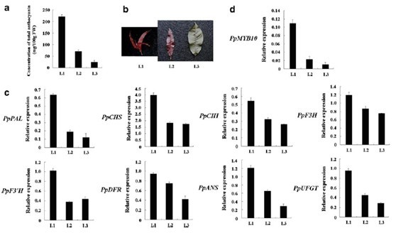 同时,该学科组通过对红叶桃、普通桃相关基因序列、表达情况的比较分析,发现光呼吸相关的信号通路部分基因(GDCH 和GOX)在遮光、热胁迫处理以后表达量上升,而花青素相关的结构与调节基因则呈下降趋势。在拟南芥的花青素合成结构基因chi的突变体中发现,虽然该突变体不能积累花青素,但在相关条件下,GDCH 和GOX基因同样出现表达上调。这些结果表明光呼吸信号途径中的部分基因可能是花青素合成和积累途径的拮抗调节因子。该结果以Coordinated regulation of anthocyanin biosynthesis through photorespiration and temperature in peach (Prunus persica f. atropurpurea)为题,在林业科学SCI期刊Tree Genetics & Genomes(JCR专业领域排名top10%)上发表。图1 桃转录组基因和转录因子的分类及其组织表达特性