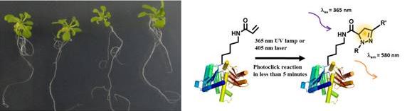 该研究通过基因编码的方法实现了AcrK在大肠杆菌和哺乳动物细胞中蛋白的特异性插入,并在365nm紫外或405nm激光激发下与四唑化合物进行点击化学反应,实现了大肠杆菌细胞骨架蛋白FtsZ的活细胞荧光标记。同时在模式植物拟南芥中实现了基因密码子的扩展,这为我们利用基因编码非天然氨基酸结合光点击反应研究植物微丝骨架的动态组装机制奠定了基础。