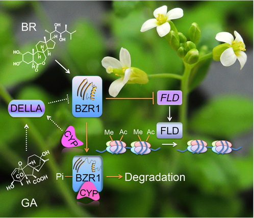 甾醇类激素BR信号途径核心成员BZR1结合组蛋白去甲基化酶基因(FLD)负调控其转录,进而控制开花。蛋白异构酶(CYP)识别BZR1使之构象改变控制该蛋白降解过程,并影响赤霉素信号途径重要成员DELLA与BZR1的互作。