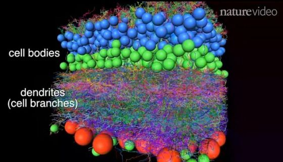 为了完成这项复杂任务,300名学生用了近3万个小时对每个细胞的“枝杈”进行追踪,绘制出一个精确模型。研究中,科学家发现了一种新型细胞,被称之为“XBC细胞”,能够将来自光感受器的视觉信息传输给其他细胞。尽管耗费了大量时间,这项研究也只绘制出老鼠视网膜0.06%的区域的3D图像。