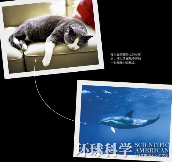 来自人类、猫及其他陆生动物的病原体正陆续入侵海洋,并攻击海洋哺乳动物。一种源自负鼠的寄生虫杀死了许多加利福尼亚海獭;海豚正因猫的某种寄生生物而丧命。
