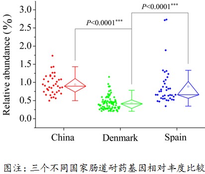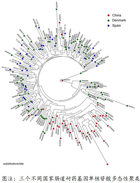 研究进一步将1093个耐药基因分成149个不同的耐药基因型;中国人肠道中含有70个耐药基因型,丹麦人45个,西班牙人49个。随后利用高通量测序原始数据对所有耐药基因的相对丰度进行计算,结果显示,中国人肠道微生物耐药基因的丰度最高,西班牙人居中,丹麦人最低。对耐药基因单核苷酸多态性的聚类分析表明,中国人肠道耐药基因不同于丹麦和西班牙人,而后两者同属于欧洲国家。这种差异可能一方面由于肠道菌群的差异造成,另一方面很可能归咎于不同地域抗生素使用的偏好性不同。