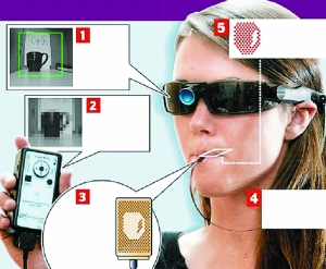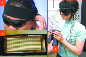 (图4)前额导盲仪(1)的工作原理与舌头导盲仪类似,影像会被数据处理器(3)转换为电脉冲通过电极感应器(2)来刺激前额。